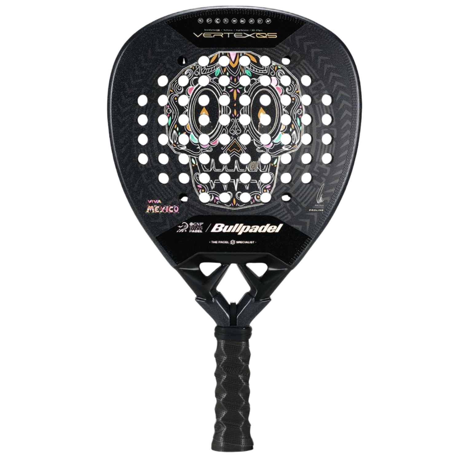 The Bullpadel Vertex 05 MX LTD Racket features an imposing design that merges strength, precision, and the Mexican spirit into a high-impact visual aesthetic.