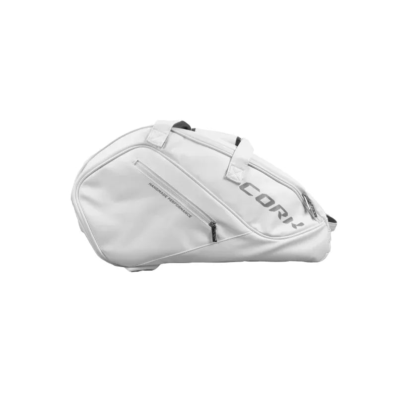 It has 2 thermal pockets with a total capacity of 4 rackets. It has a pocket in the center with lined peach skin, and a closed inner pocket and two open pockets for glasses and mobile phone.